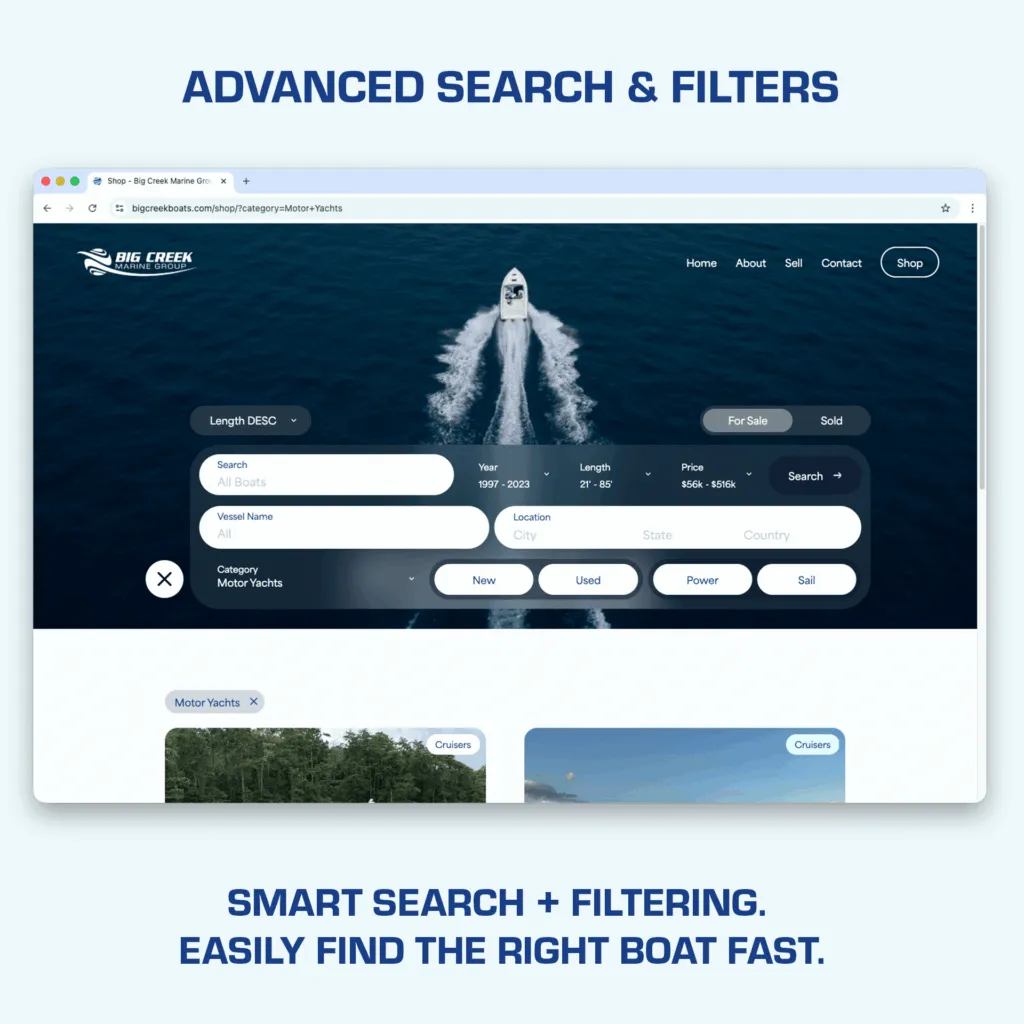 A fully custom WordPress theme built for a boat brokerage, engineered with deep API integration to pull live inventory directly into the site. The platform includes advanced search and sort functionality, performance-minded data handling, and analytics-driven features that help users find the right vessel quickly and reliably.