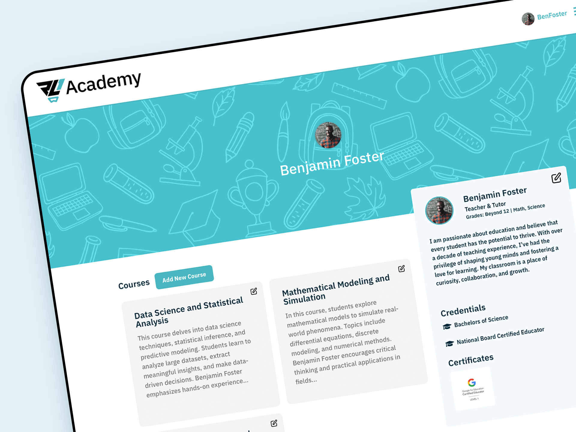 Key functionality: a structured teacher onboarding and approval process, detailed public instructor profiles, tools for creating and managing courses, and a comprehensive search system across all teachers and offerings.